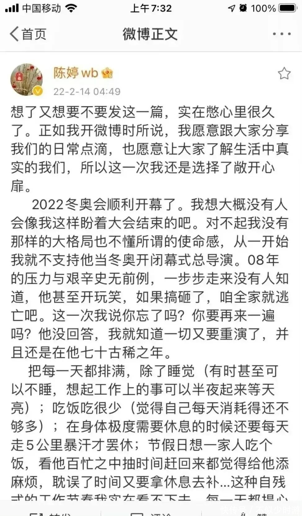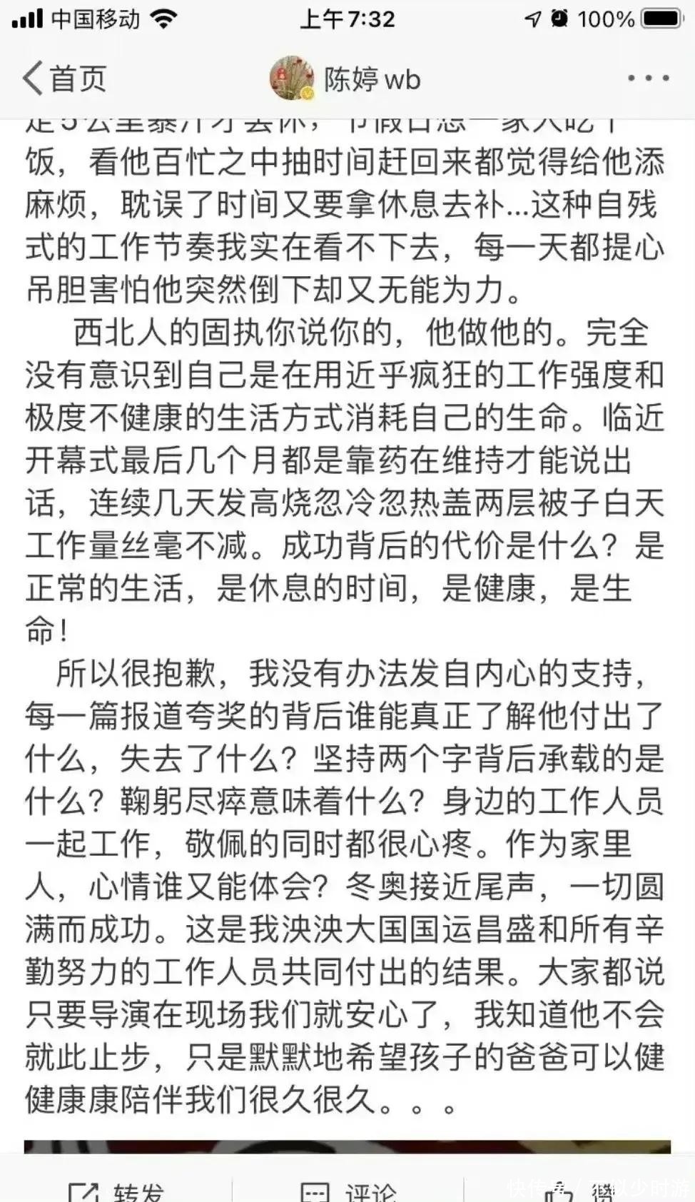 冬奥会筹备进入关键期,一位年逾古稀的导演日夜奋战在一线,作为妻子,她心疼至极,遂在社交媒体倾诉肺腑之言。