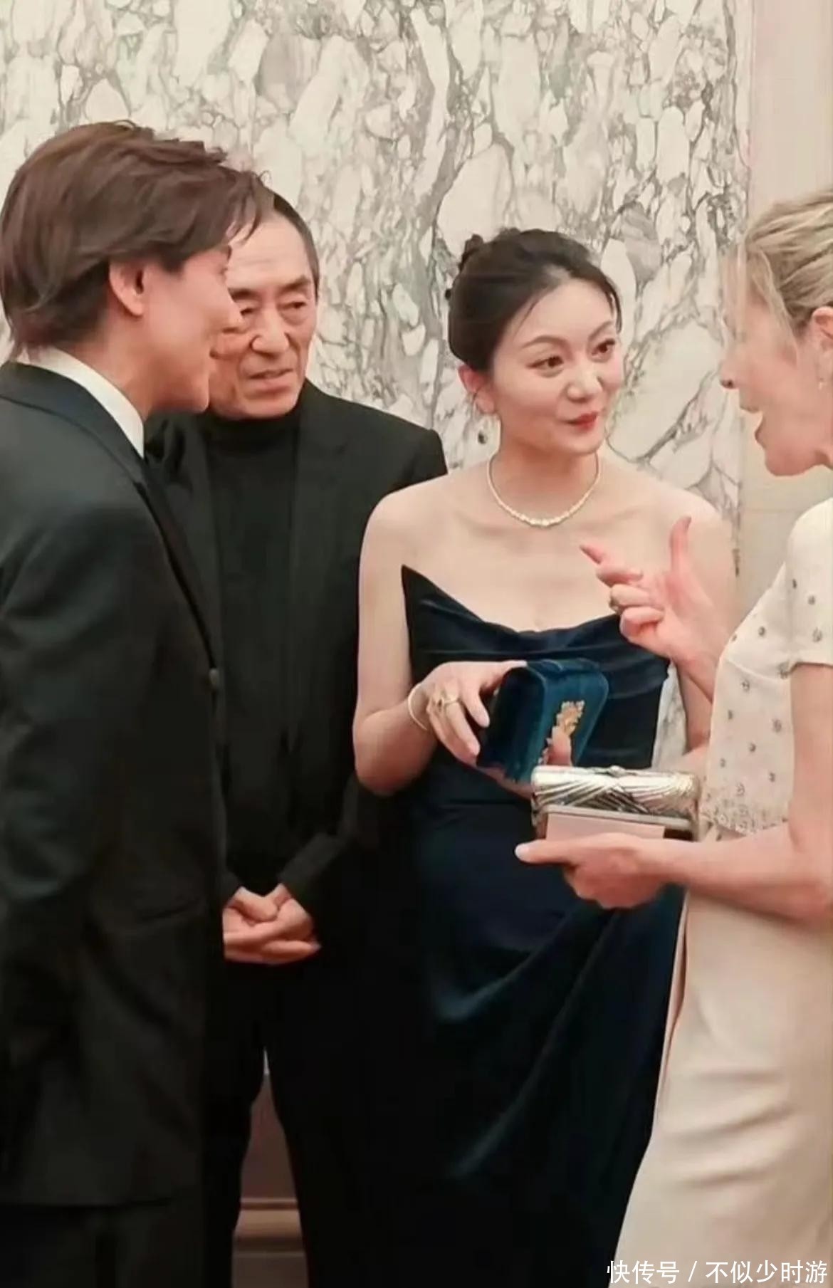 一身黑色礼裙,仪态端庄,气质高贵,在国际社交场合游刃有余,甚至引领全场风范,反倒是张艺谋安静跟在其后。